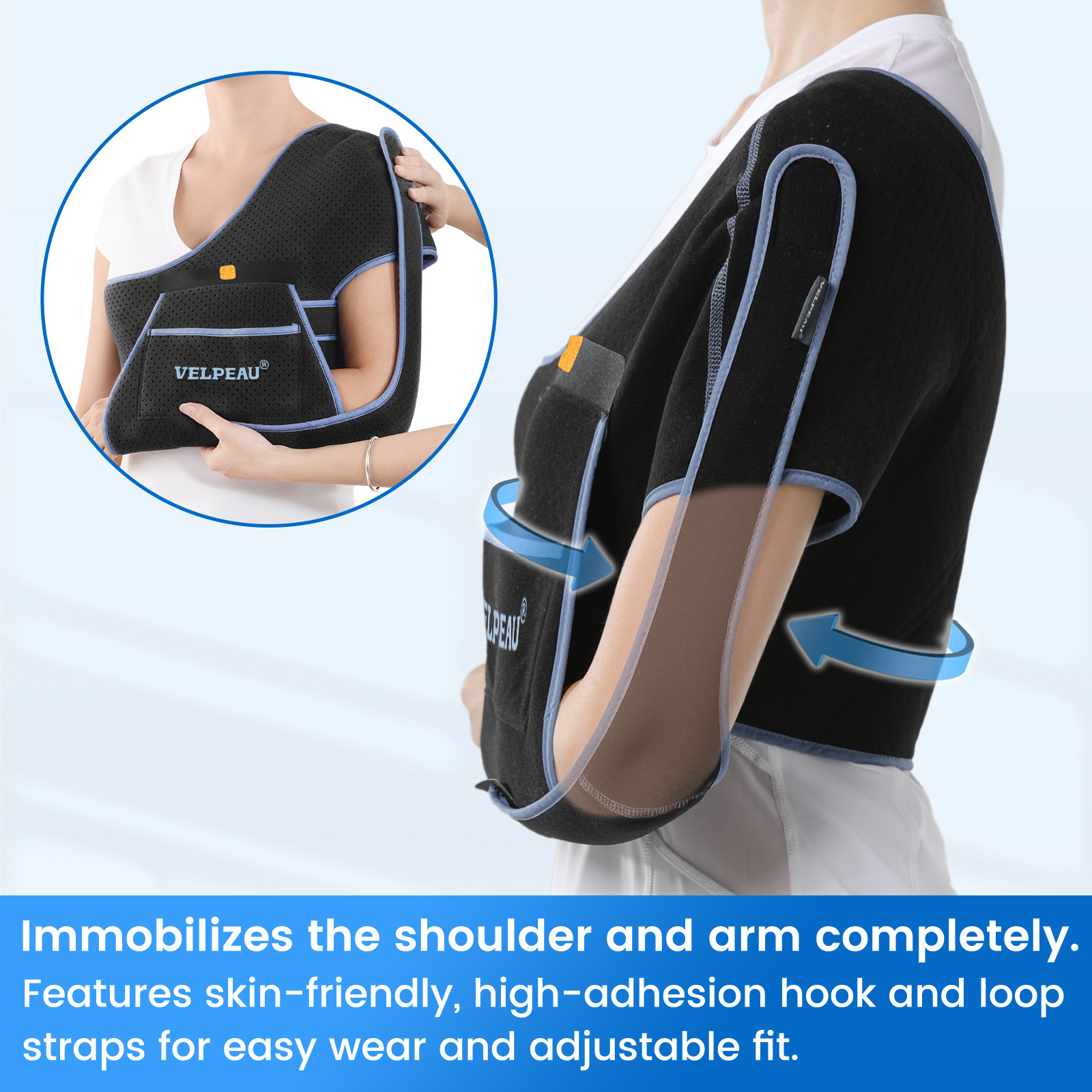 L'attelle d'épaule Velpeau est une écharpe fonctionnelle pour l'épaule et le bras qui limite les mouvements articulaires afin de protéger les muscles et les ligaments blessés. Elle sert également d' immobilisateur d'avant-bras et d'écharpe de bras avec poches, conçue pour réduire l'activité de l'épaule tout en assurant un confort optimal, même pendant le sommeil.